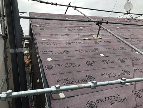 屋根は、カバー工法です。既設の屋根に新しい防水シートを張ります。そして、屋根材を被せていきます。
