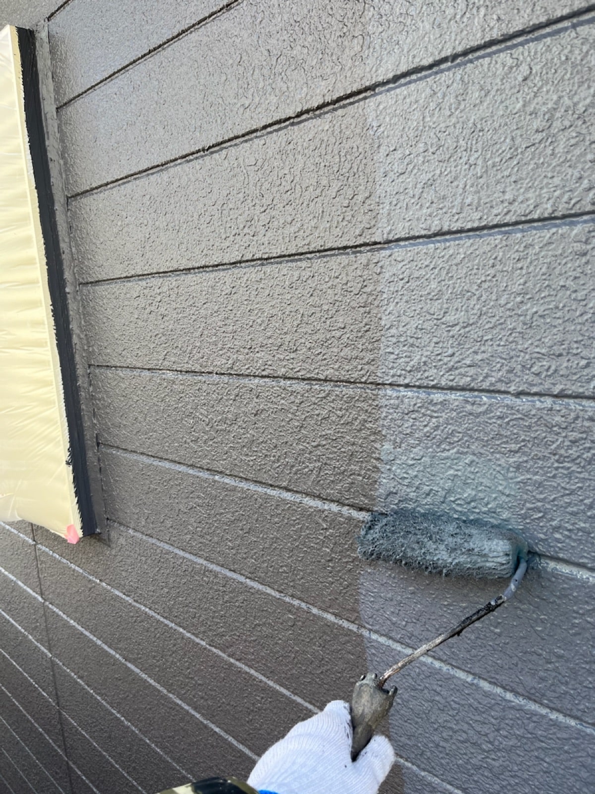養生を行い、下塗り→中塗り→上塗りを行います。上塗り後、養生を外し付帯部の塗装作業に入っていきます。