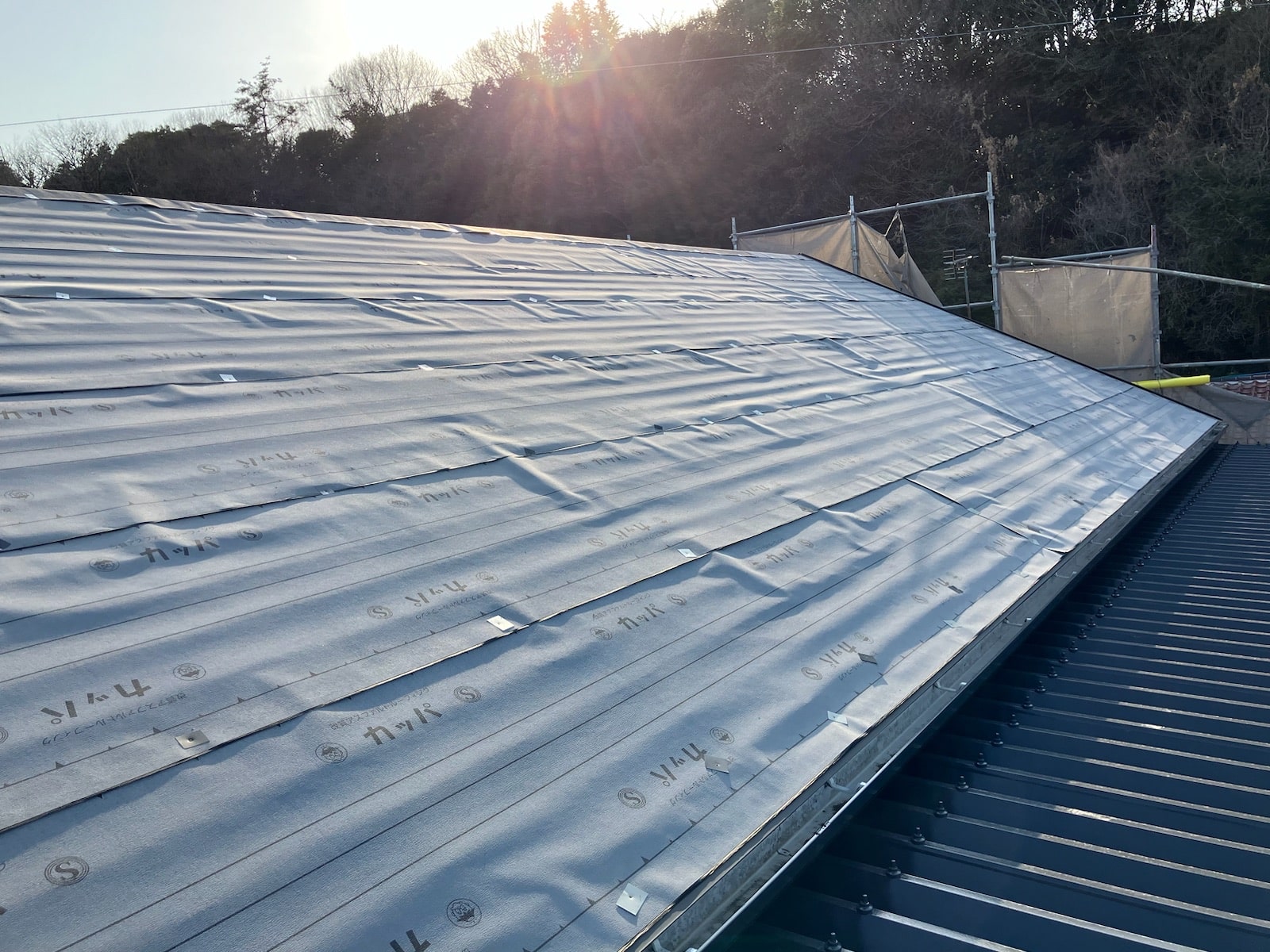 屋根は、カバー工法です。既設の屋根に新しい防水シートを張ります。そして、屋根材を被せていきます。