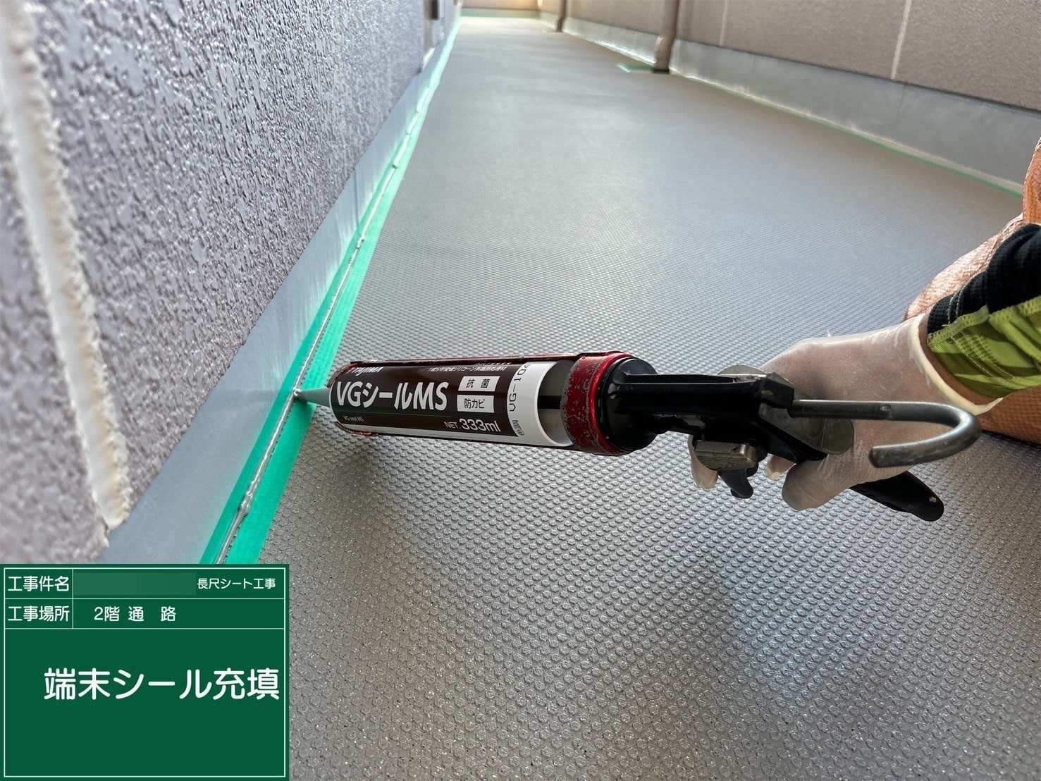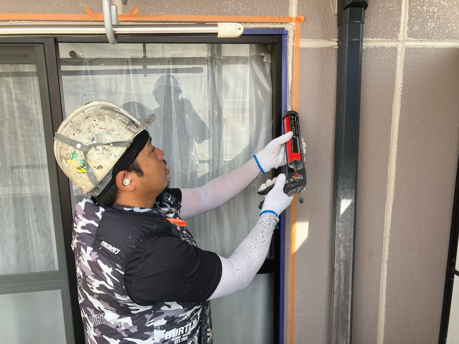 養生テープで目地の養生をおこない、プライマー塗布後目地材を打設します。